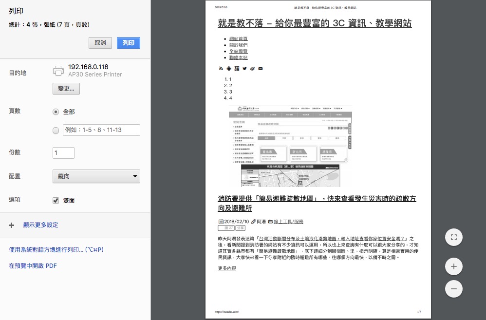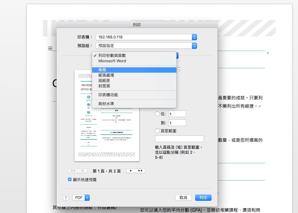 如果是透過 Office 或 PDF 軟體等,還可以有更多的佈局設定來選擇列印方式跟排版。