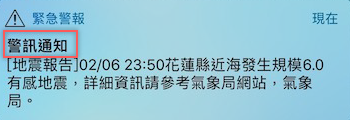 而地震過後(時間不一定)會收到「警訊通知」的縣市,為這次地震有感受到震度的區域,換句話說如果你的所在縣市是 0 級,就什麼也不會收到。