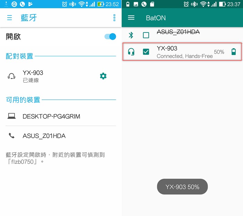 一般未升級到 8.1 版的 Android 設備,到藍芽設定區只能看到可連線或已連線的裝置清單,不會顯示電量,但下載 APP 之後只要開啟就會在清單上顯示出來。