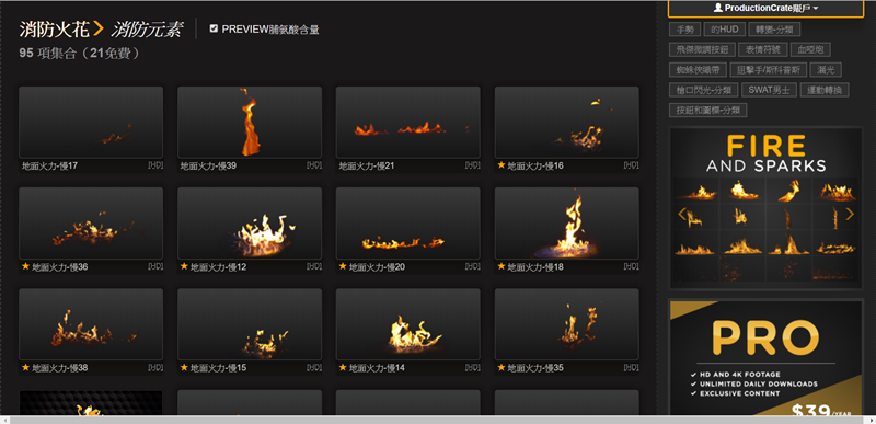 直接來看 HD 和 4K 消防火花專區,可以看到有像火燒房子、爆炸的火光與粉塵、光點式的火花等類型,十分豐富。