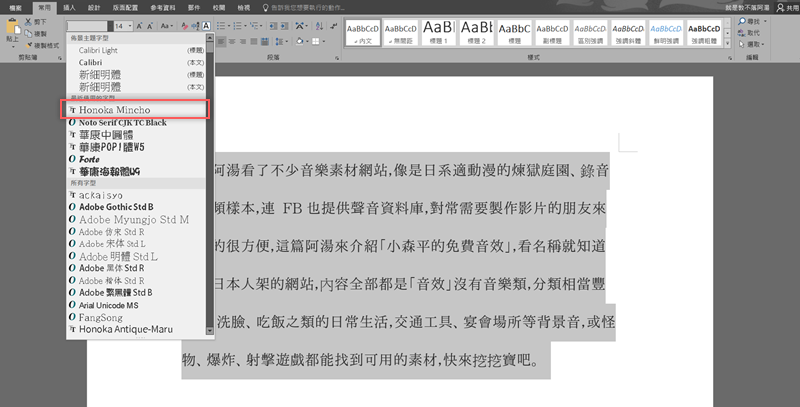 接下來阿湯將剛剛使用的「Honoka Mincho」刪掉,再度開啟同樣一份 Word 檔內容的文字仍然是已套用的狀態,並同步顯示在左上方字型區,只是在選項中已經找不到「Honoka Mincho」了,因為已移除,除非再度安裝不然只有這份有設定內嵌的文件可以顯示出這款字體。