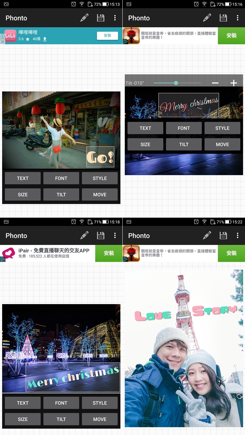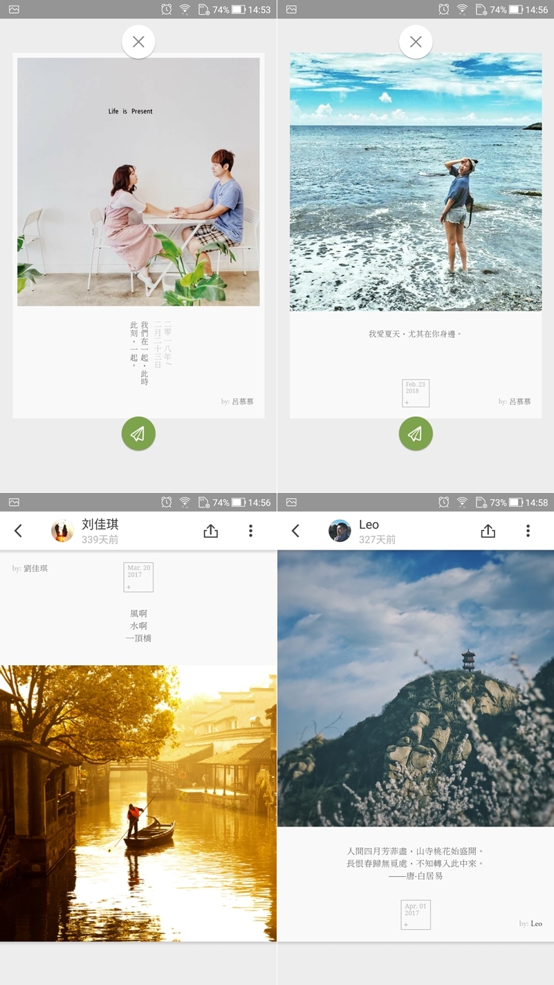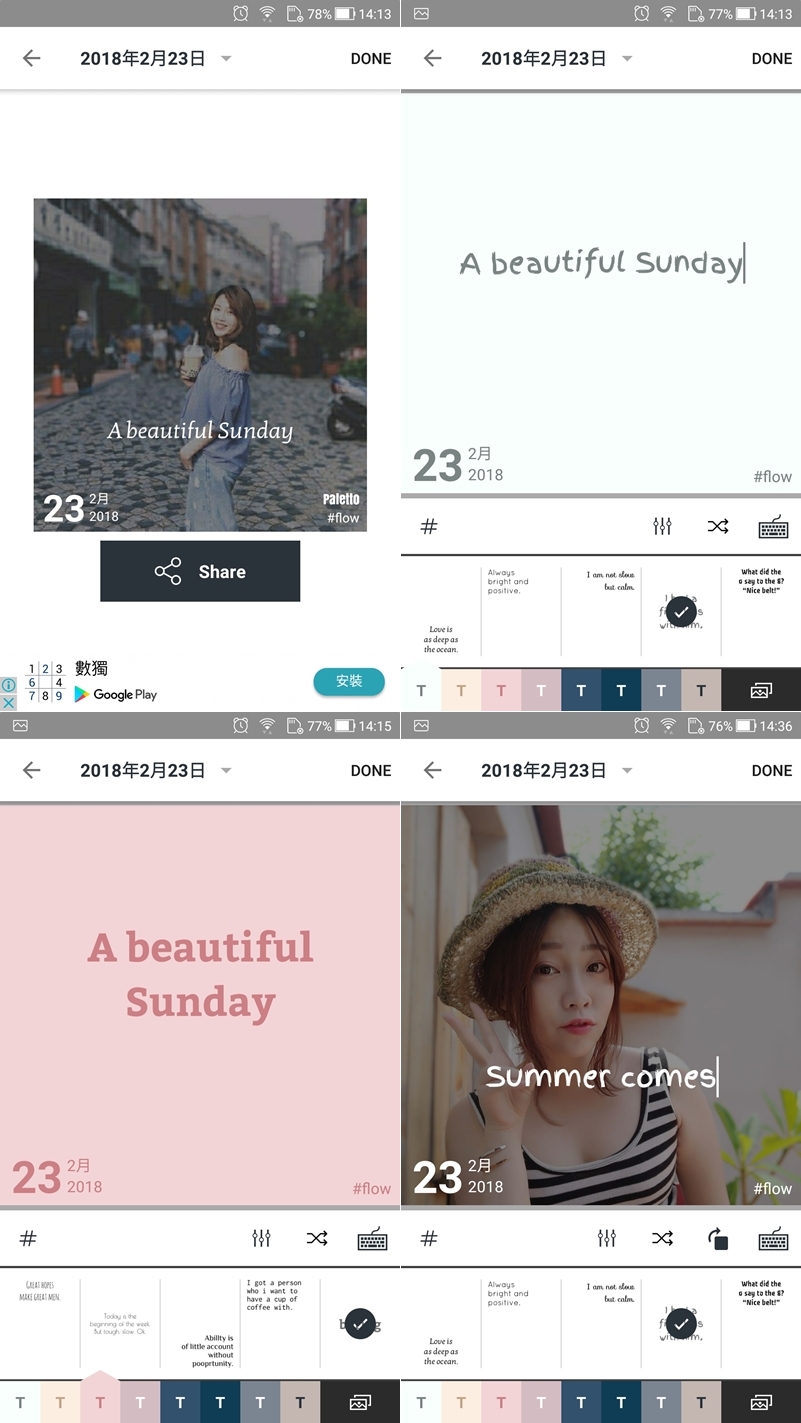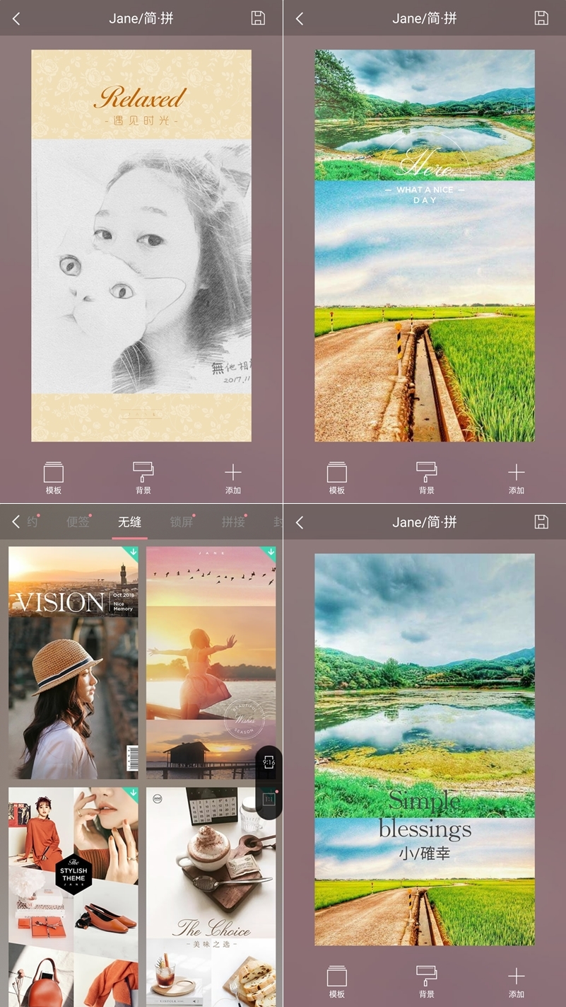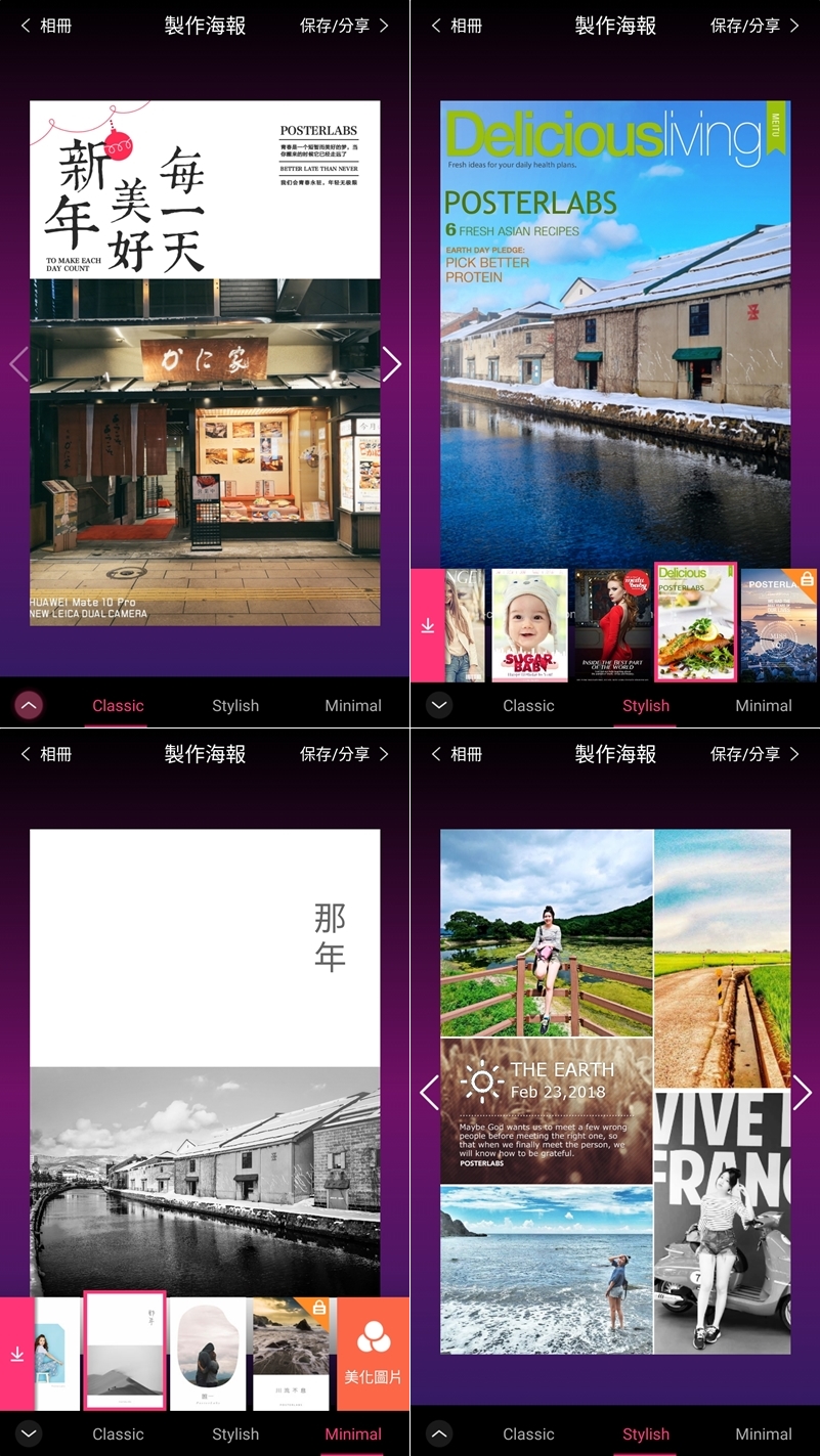 可用單張照片或多張拼貼,包含各種尺寸比例和背景色彩、花樣,以及上千種設計模板,一樣走清新浪漫的路線,但因為也是大陸開發的 APP 所以同樣有字型無法完全套用的問題,只能自己調整了。
