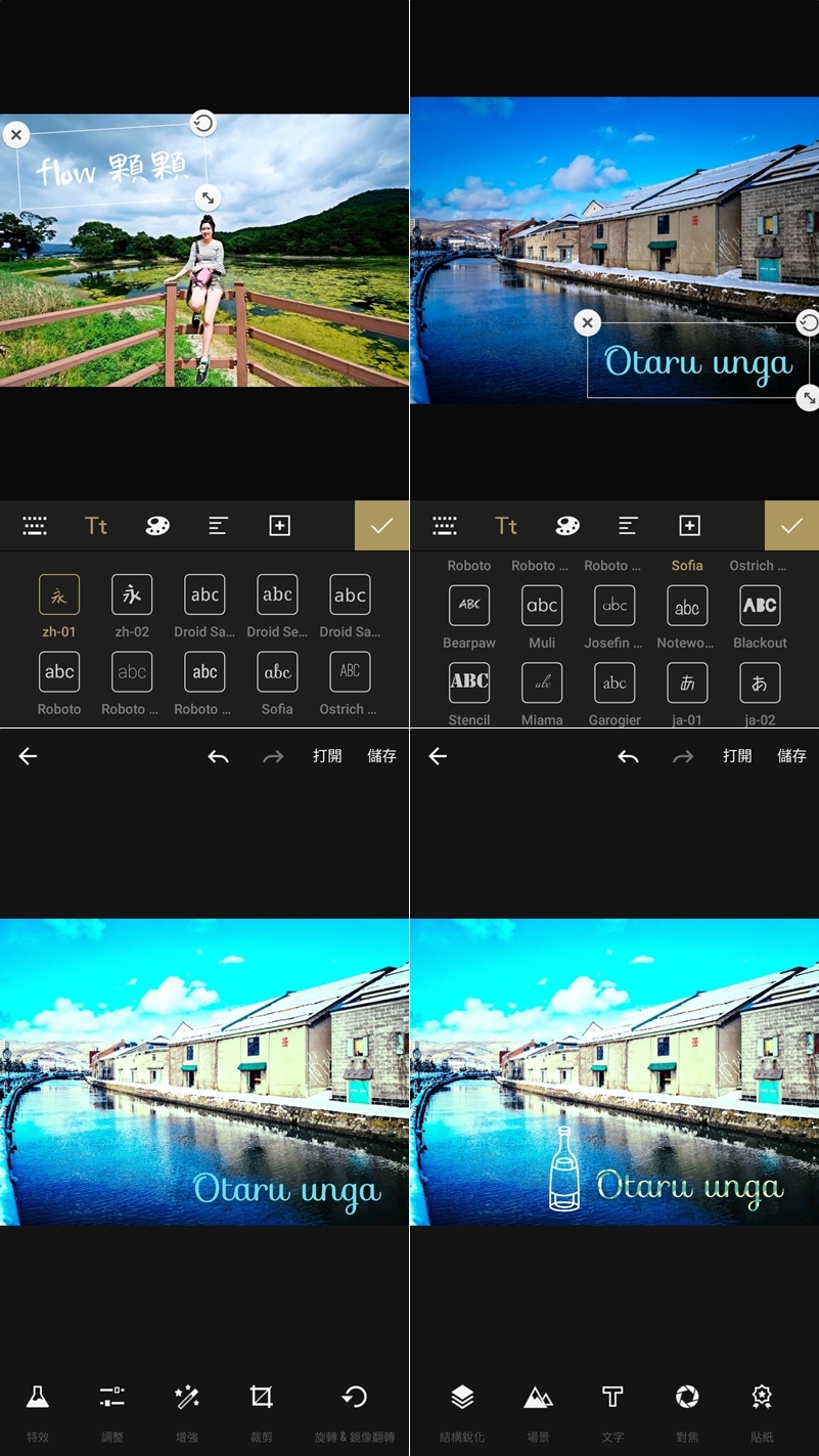 除了基本的美化及場景特效,還有多款中、英、日文字型,顏色方面可用多色混搭,也有一些可愛的小貼紙可放進圖片,供免費使用的素材還蠻多的,細節的調整程度也不錯,內建還有其他主題模板可套用,算是簡單好上手的一款 APP。