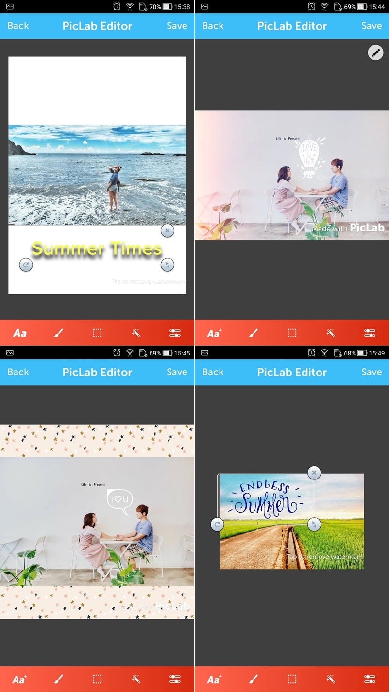 以文字設計的圖樣貼紙為主,透明度、陰影、色彩、圖層、背景紋理都能調整,濾鏡也蠻美的還有一些漏光特效可套用,搭配簡單的修圖功能可以增加圖文豐富感,可惜就是付費素材比較多一點。
