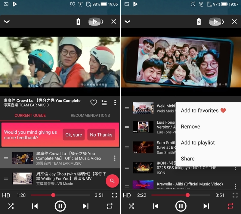 可從底下功能列設定隨機或重複播放,原始歌單也能進行更改、加最愛、移除、分享等編輯功能。