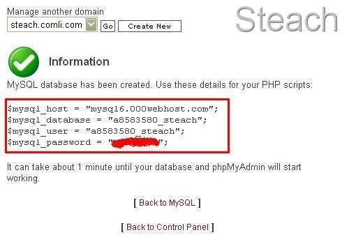然後會看到以下畫面,表示創建成功,紅色框框裡面依序為SQL主機位址、資料庫名稱、資料庫使用者、資料庫密碼,這些資料要記起來哦,稍候在設定config時會用到!