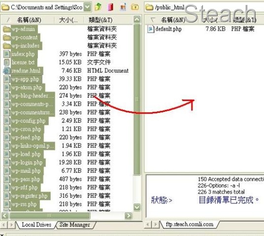 在上面檔案一切準備就緒後,我們就來將剛剛設定好的Wordpress程式上傳吧!!使用FTP來上傳,如果你沒有FTP軟體或不知道怎麼使用FTP傳檔可參考以下連結: