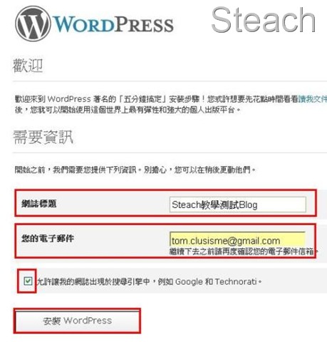 如果你先前網域有綁定成功的話,在上傳完wordpress程式後,就會出現安裝畫面囉,輸入你的站台標題及email(這些資訊之後也可在後台再修改),按下安裝Wordpress