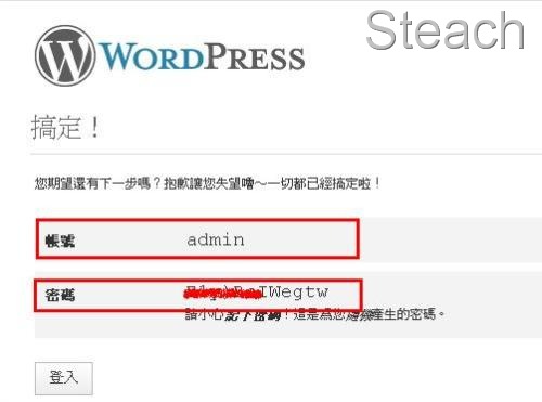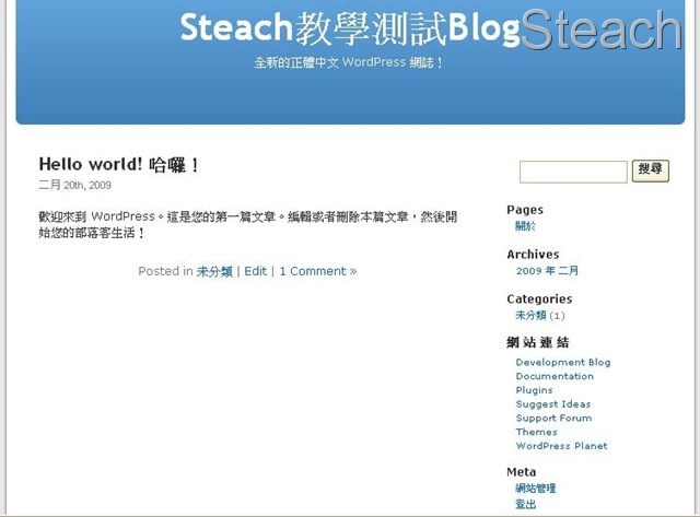 這樣就完成了安裝wordpress囉,趕緊先去看看blog是否都正常哦!後台可先自行摸索一下,大概就知道功能上的使用方法,blog網址為 http://steach.co.cc/ 後台登入位址為http://steach.co.cc/wp-admin/ 之後站長再慢慢介紹一些佈景更換,外掛等等,網誌修改外觀之類!雖然剛裝完看起來很不怎麼樣,不過在經過一番努力之後,就可以讓你的部落格多彩多姿囉!!