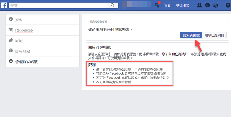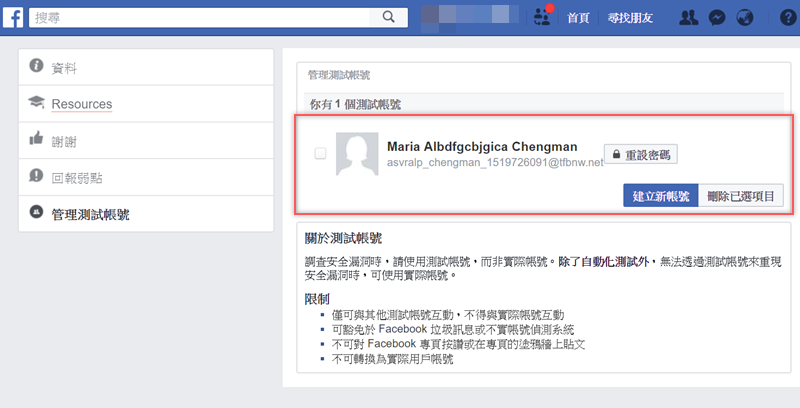 阿湯本身的 Facebook 帳號底下就有粉絲團及社團,所以不管是寫文章或是做教學示範都可以用那些帳號,但如果你只是想測試一些基本功能,或是想看看成立粉絲團後的頁面大概是長什麼樣子,臉書有提供建立「測試帳號」的選項,主要是利用虛擬帳號來協助調查安全漏洞,當然也能自己試驗一些功能,但要注意不能與實際帳號互動,不可按讚或貼文也不能轉為真實的用戶,想拿來當殭屍(假號)用的朋友可能要失望了。