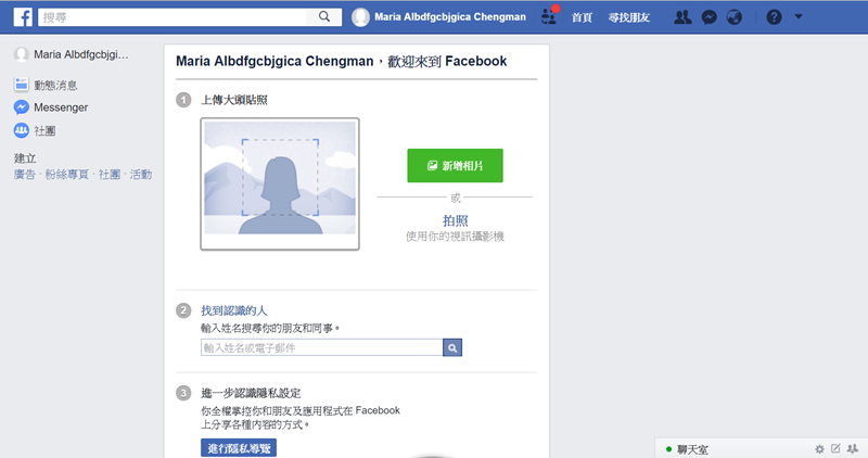 就跟一般帳號的起始頁面一樣,提示你可以放照片、找朋友或進行其他隱私設定,對於使用臉書多年的我們來說,應該已經忘了剛開始玩 FB 時的樣子了。