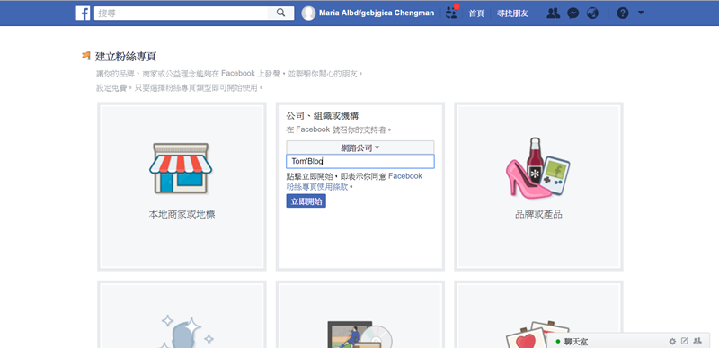 建個粉絲團試試,選擇類型、設定名稱即可開始。