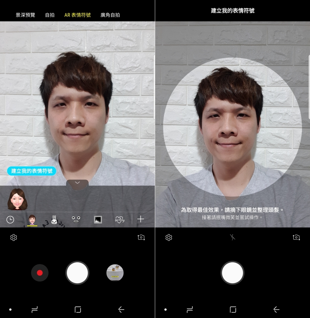 那麼我們就先來介紹這次很有趣的 AR 虛擬人偶,使用方式很簡單,而且可以建立非常多虛擬人偶,不論是前鏡頭或後鏡頭都能夠切換到 AR 表情符號這個功能,然後點擊「建立我的表情符號」,拿下眼鏡後拍攝一張照片。