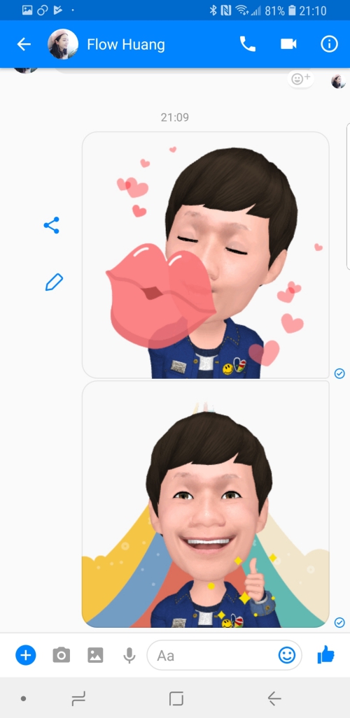 建立虛擬人偶並不算什麼,最有趣的是還會自動幫你建立 18 種不同的動態虛擬人偶符號貼圖(GIF 動態圖檔),讓你可以直接運用在通訊軟體中和朋友聊天使用,真正專屬自己的動態表情貼圖,不再和別人撞圖啦,目前阿湯測試過 LINE、FB Messenger、Wechat 等通訊軟體都能使用(直接選擇圖片上傳就可以了)。