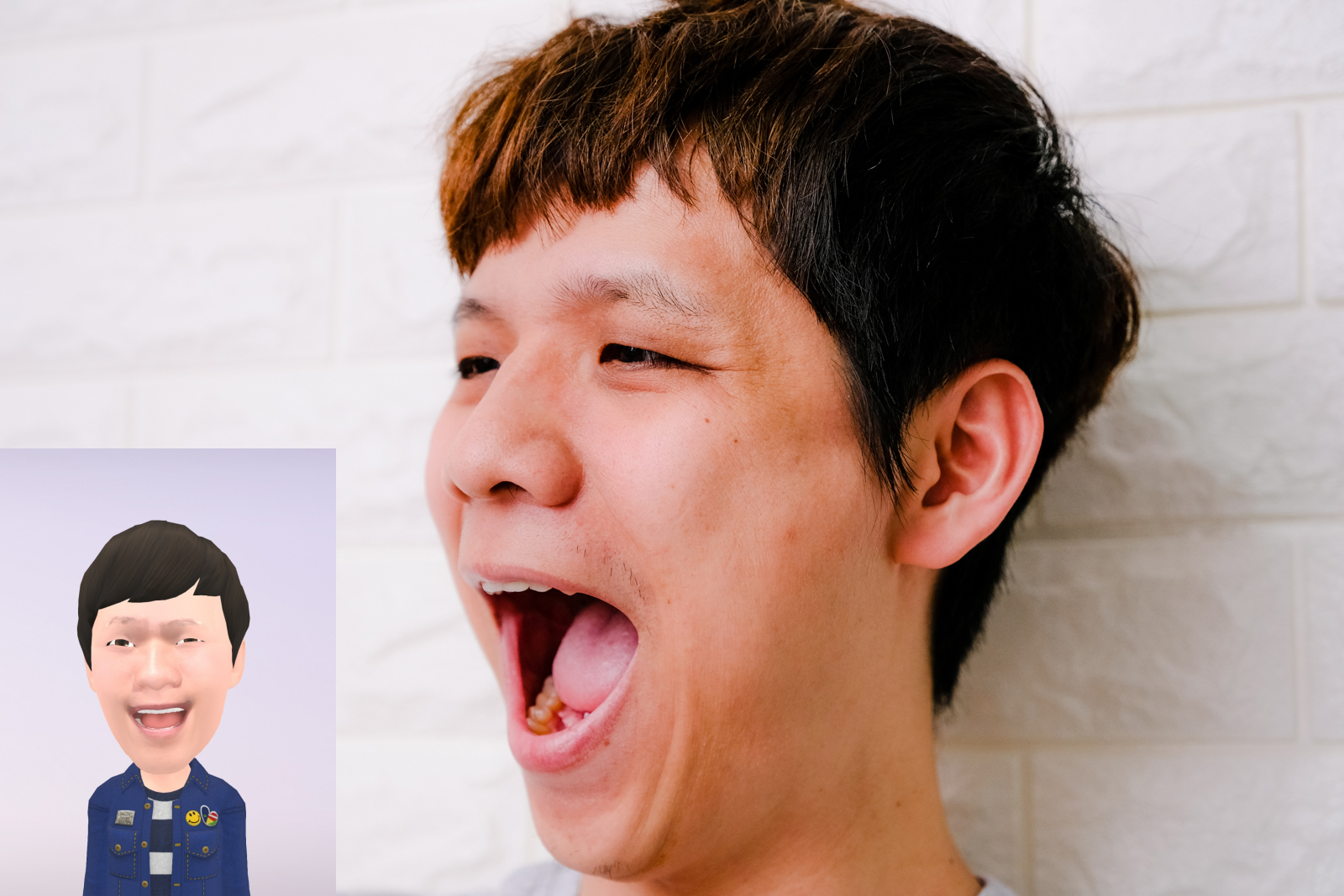 阿湯也實際做了不同的表情進行拍照,順便拍了實際的臉給大家做比對,這虛擬人偶的表情會完全模仿你臉部的動作,包括眨眼、大笑等,當然除了拍照之外,你也可以用虛擬人偶來錄製影片,如果再將人聲利用變聲器等調整後就會變的很有趣了。