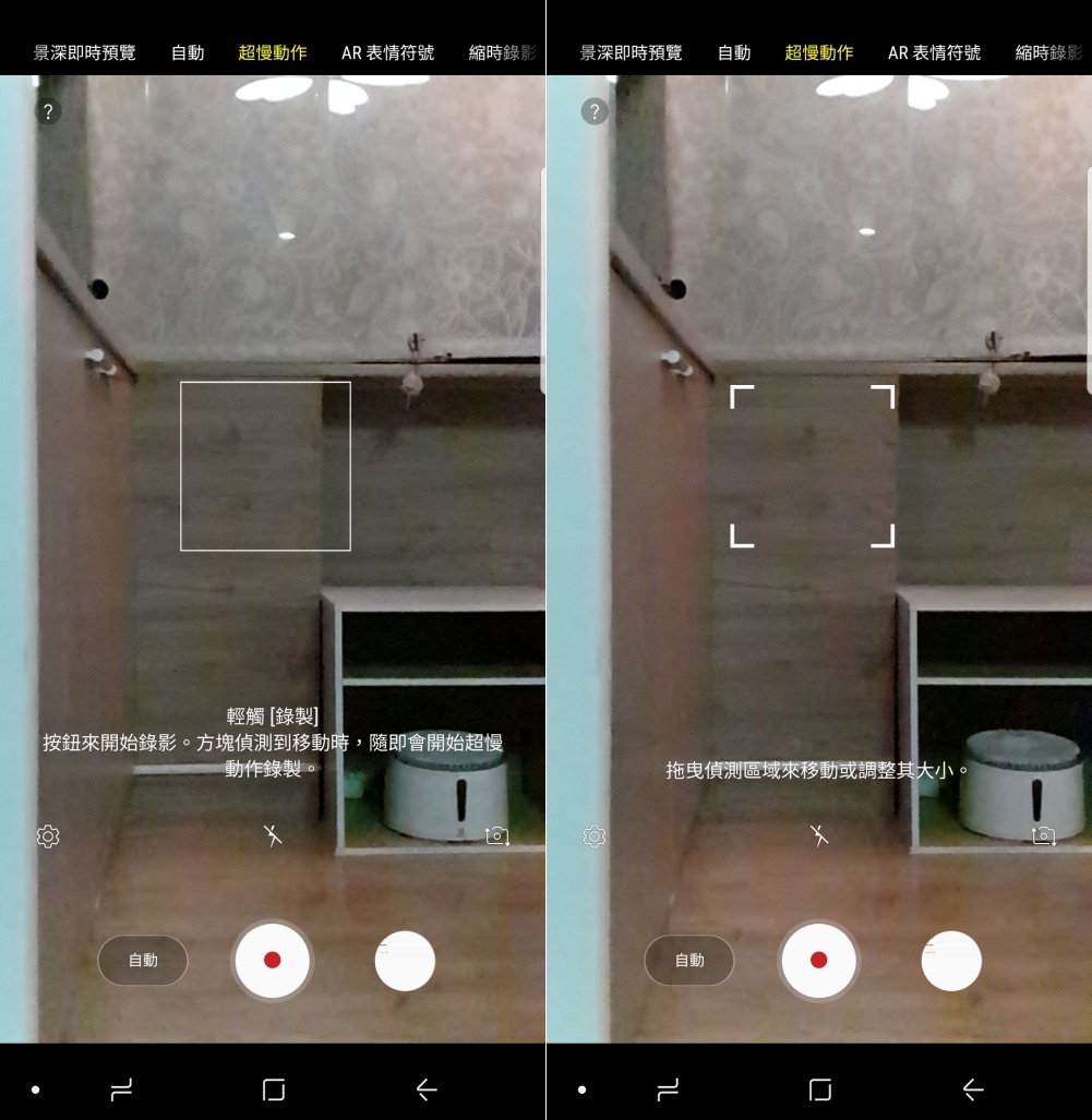 接下來方塊就會呈現黃色表示目前正在偵測方框中的變化,只要有動靜就會立刻進行慢動作攝影,其他的時間則是照一般速度正常錄影,所以當貓往上跳躍經過方框時就不會錯過,會自動抓拍慢動作,非常的實用(當然,也能夠切換成手動模式)。