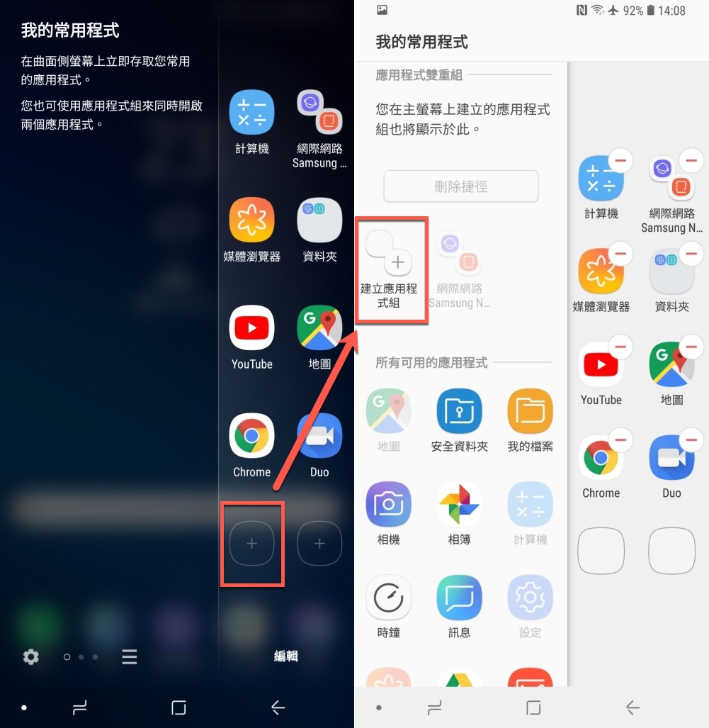 但在 Samsung Galaxy S9/S9+(Note8 也可用)中,現在可以透過「建立應用程式組」的方式,一鍵同時開啟二個 APP 且自動以多重視窗的方式呈現,使用方式很簡單,只要從曲面側螢幕中點擊新增(或替換)應用程式,就可以看到有一個「建立應用程式組」。