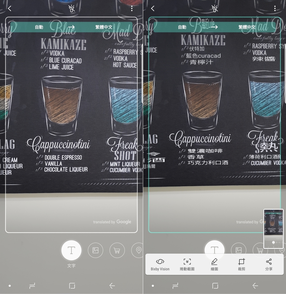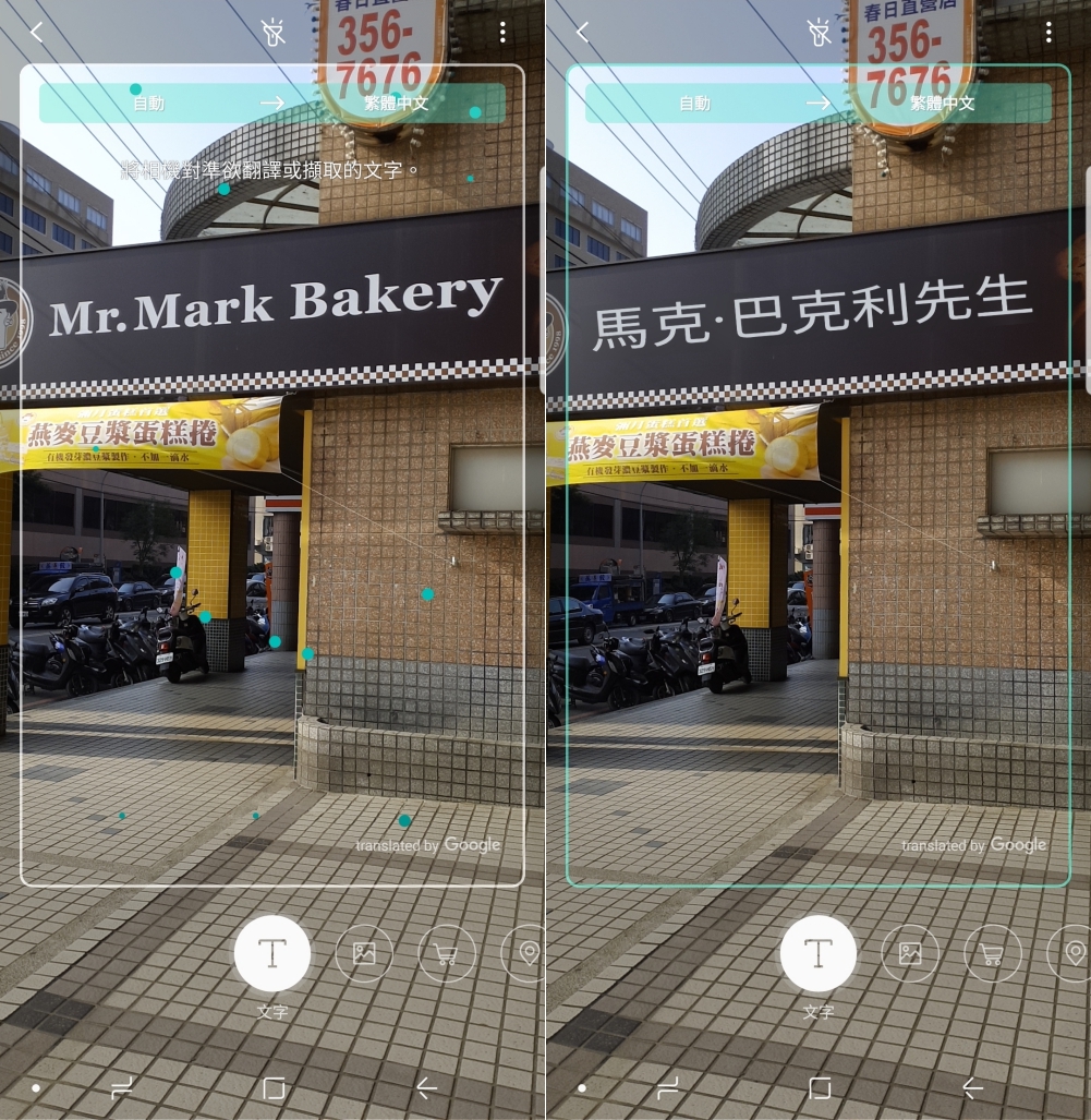 首先看一下翻譯的功能,先前 Bixby 可以將文字 OCR 辨識後將文字取出後翻譯,而這次全新的 Bixby 2.0 帶來的是,我們只要將相機對著想要翻譯的內容以及選擇語系就會自動翻譯,而且會直接在畫面上取代掉原本的文字,看下圖左為原畫面,右圖為翻譯畫面,幾乎是直接嵌入啊。