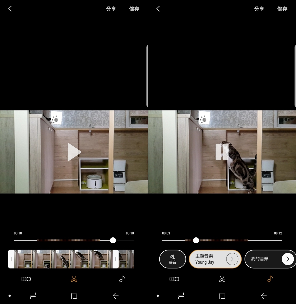 拍攝完後可以做簡易的片段剪輯,且內建就會自動幫你配上音樂,你也可以手動選擇配樂。