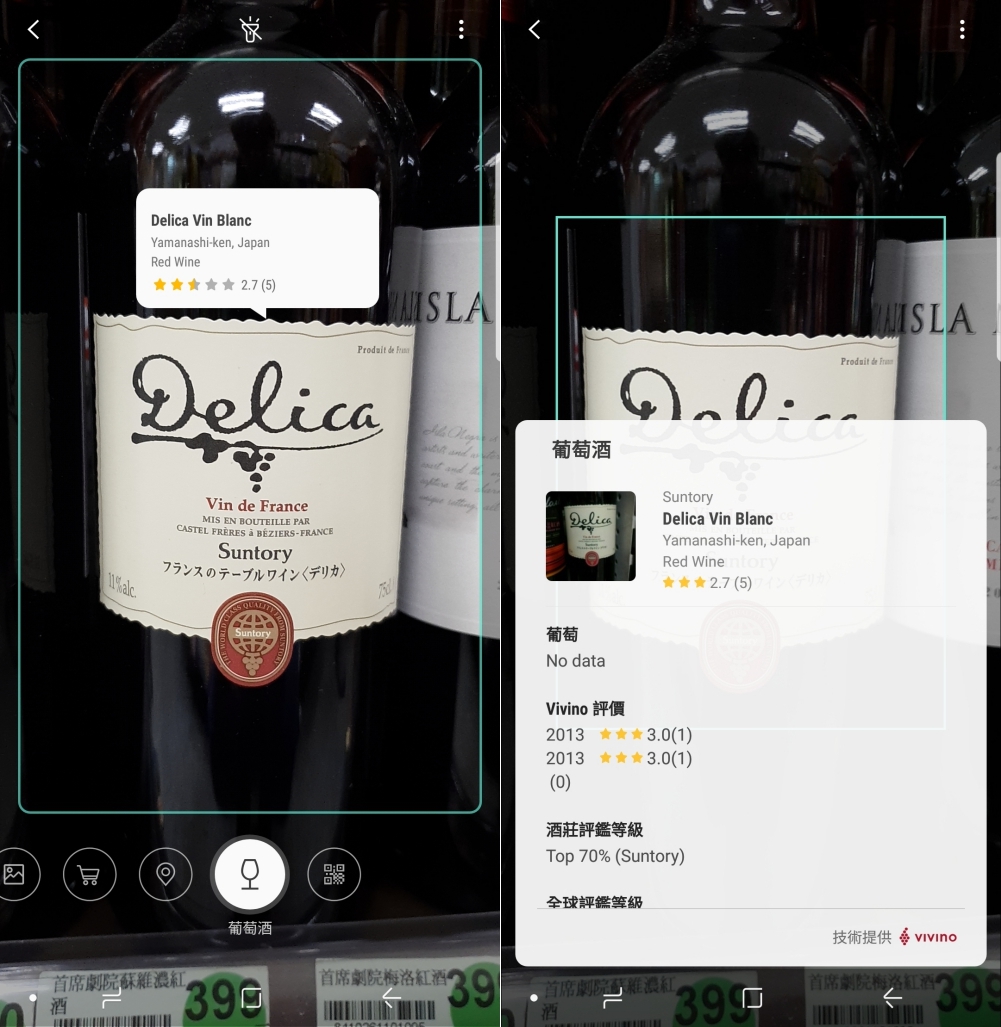 查詢酒標時,也只要將相機對著酒的正面標籤,就會自動查詢這是哪一款酒以及相關評價。