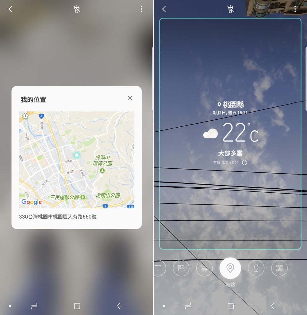 在地標功能下,當手機朝下時,會顯示目前你的位置,往上則會顯示今天的天氣資訊。