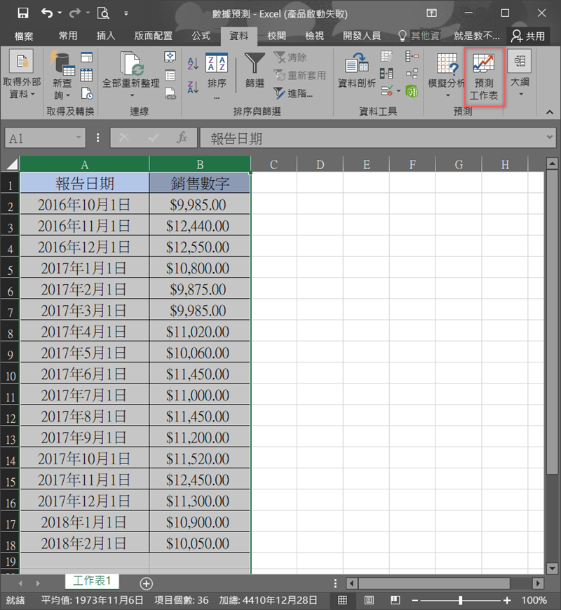 首先要有足夠的歷史數據為基礎,至少要有兩個項目才能做比較,例如報告日期與這個時間的銷售數字,必須是固定週期的統計資料,間隔必須一致(例如每個月第一天),接著選取這兩行,從資料頁籤中找到「預測工作表」。