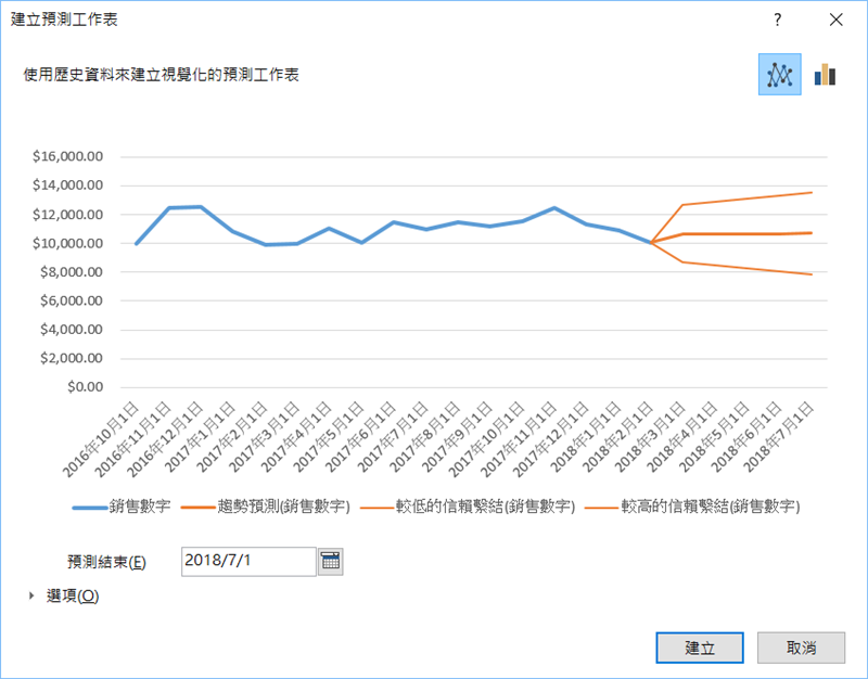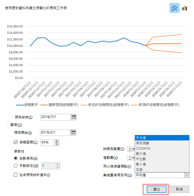 點開底下的選項可進階調整預測開始和結束的時間點,以及信賴區間、季節性設定等,也能更改範圍,及彙總用的重複項目,都 OK 後就可以點建立。