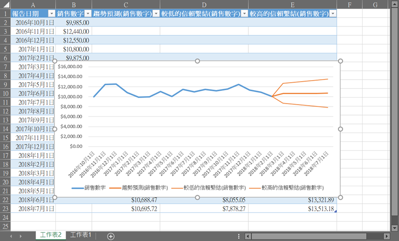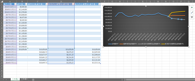 系統會自動依照你給的數據產生預覽圖,藍線的是實際表單裡現有的資料,橘線是預測出的未來趨勢,並提供較高及較低的信賴繫結,以這個範例來說未來可說是持平、稍微往上的。