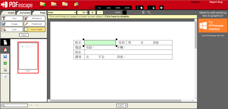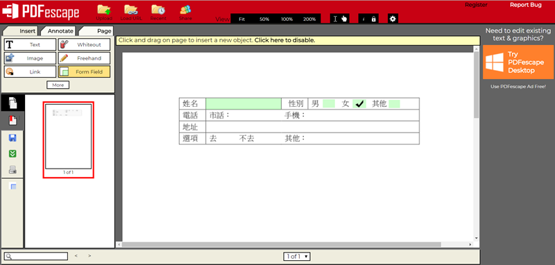 CleverPDF 這幾個實用的網站,今天要介紹的「PDFescape」比較特別,除了一般的置入形狀、裁剪、加密、簽名等功能之外,還能製作「可填式」的表單,也就是說讓 PDF 也和 Word、Excel 檔一樣是可以輸入文字、勾選項目的文件,感覺還蠻厲害的,來看看。