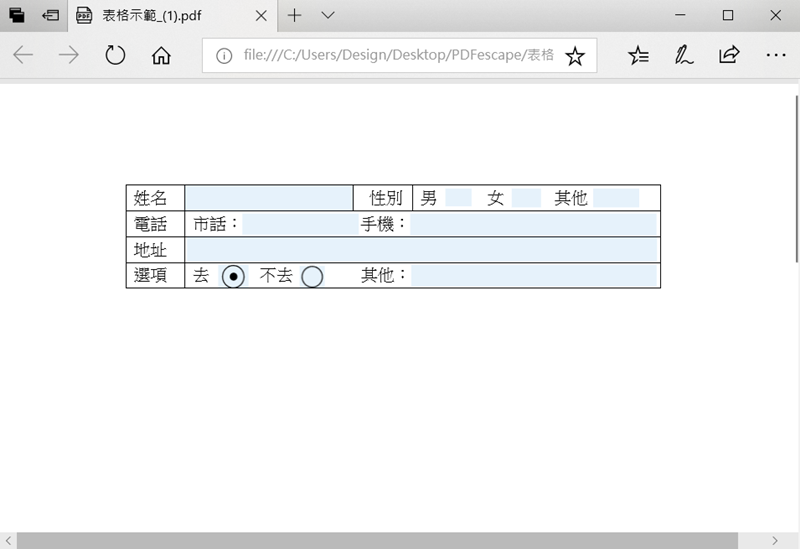 但當你點進去會發現淡藍色區域是可以編輯的,輸入文字或勾選都沒問題,性別項目剛剛設定的是可以多選,而底下的「去╱不去」則是單選的按鈕,但字體大小在設計欄位的時候沒有考慮到所以只能輸入這麼小的字,回去再改一下就好,試試看。