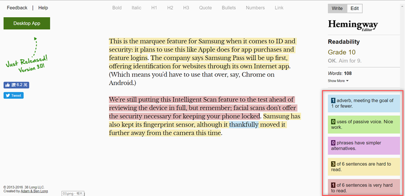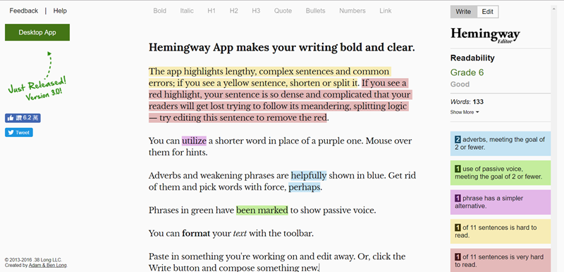 1Checker 都是相當方便又好用的校對及文法檢查軟體,但如果著重在句型方面推薦「Hemingway Editor」這套工具,提供免費的線上版和付費的桌面版,當你輸入文章之後,會利用閱讀能力指數來對文章分級,並以顏色標出難以閱讀的句子,強調的是「可讀性」這點,協助你達到文句的簡潔與通順。