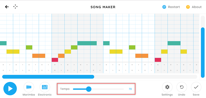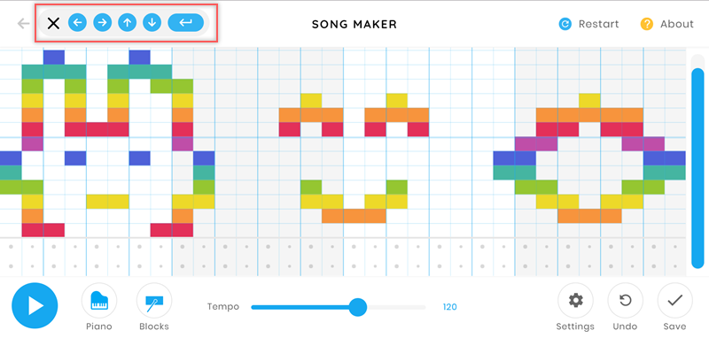 也可以像這樣隨便畫一些圖案當作曲譜,或改用鍵盤上下左右,錯了再按一次取消或點 Restart 整個重來,一起來玩吧。