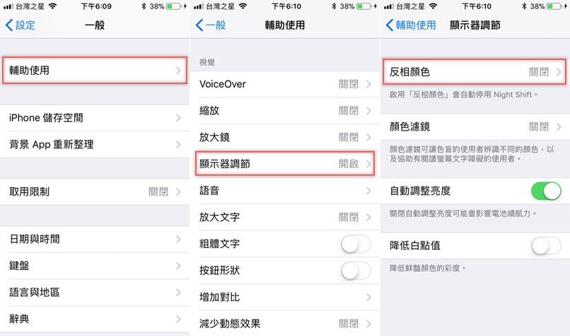 今天要介紹的功能都在設定區,但要分別從幾個地方挖出來,先來看第一項,如果你看膩了原始的螢幕顯示色彩,或比較喜歡暗一點的主題,可以從一般 → 輔助使用 → 顯示器調節 → 反相顏色。