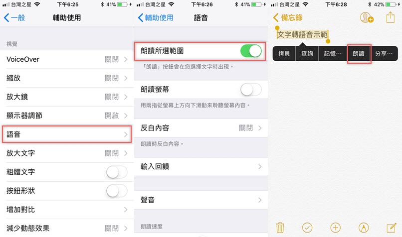 不管是閱讀英文文章或是不方便看手機的時候,語音轉文字都是很實用的功能,一樣要進入輔助使用區設定,開啟「朗讀所選範圍」之後選取要聆聽的文字,就會出現朗讀選項,也可以視需求改成朗讀螢幕或反白內容。