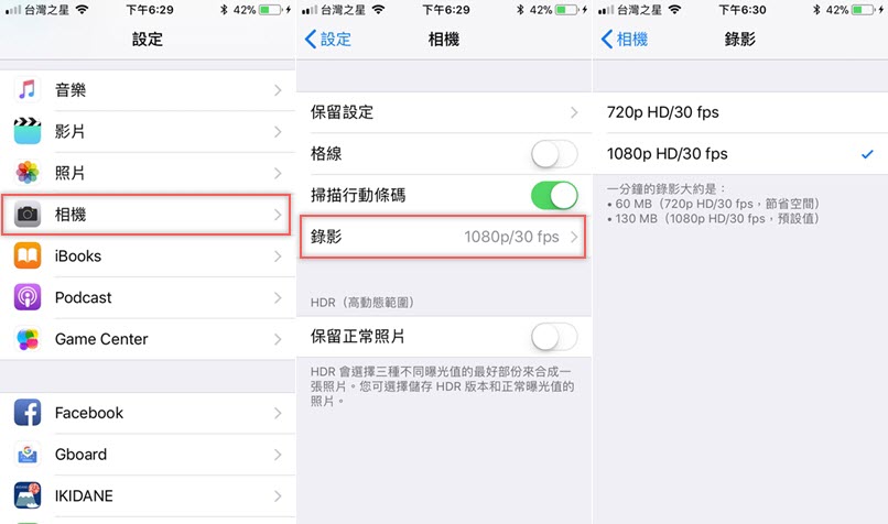 最後這項有在拍照的人應該都會注意到,從相機設定可以更改錄影時的解析度,視手機型號而不同,如果不希望檔案太大就要降低解析度,如果手機空間夠、以畫質為重的人就盡量提高吧,