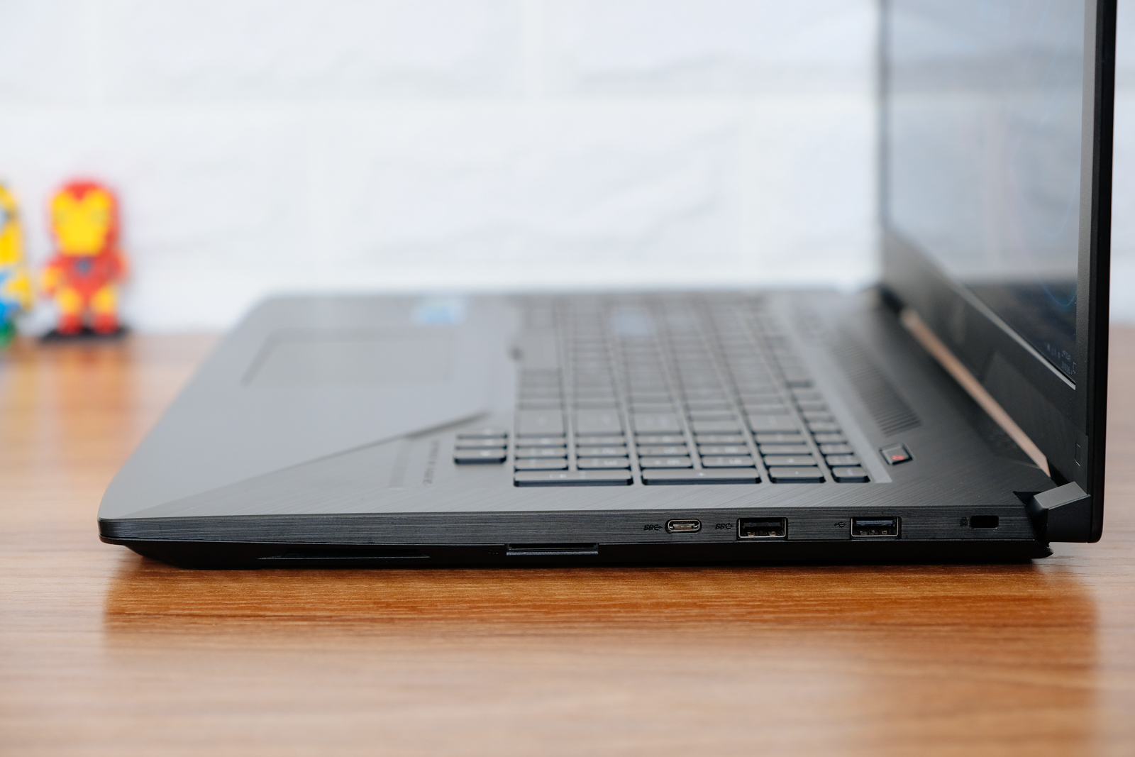 ROG Strix GL703V 的機身厚度為 2.4cm,不過由於側邊的內縮設計加上髮絲紋,看起來更加薄。