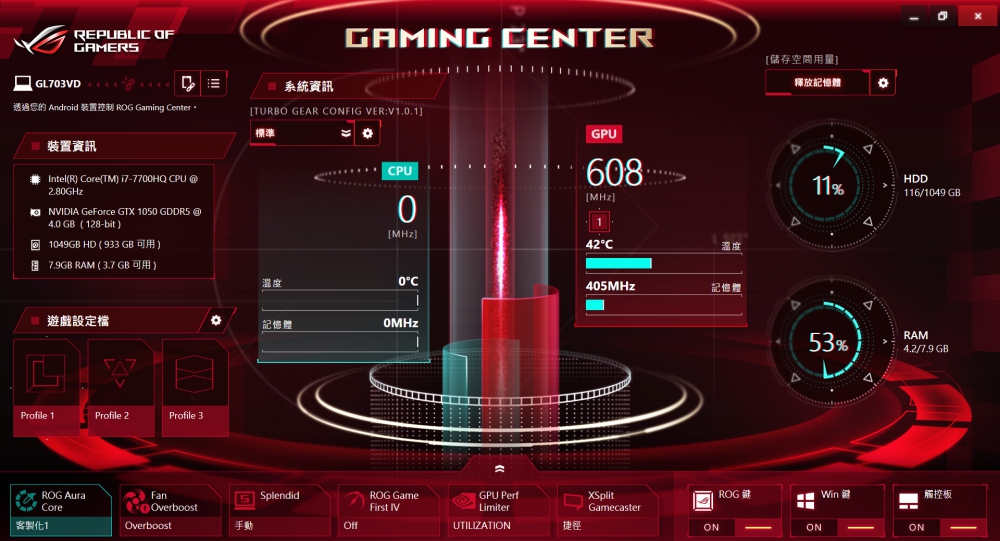 另外背光鍵盤的部份支援 ROG Aura 軟體設定,可以自行調整背光四區的色彩、漸層等,玩起遊戲來讓你聲效具佳,看的就是爽。