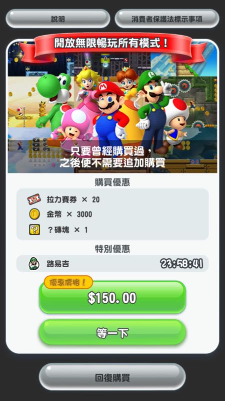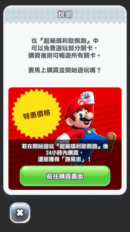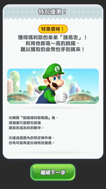 這項限時優惠包括了 Android 與 iOS 雙平台,也就是說所有玩家不只能用優惠價格購買全關卡來挑戰許多遊戲新關卡、模式,甚至還能獲得「路易吉」的隱藏角色與完成遊戲特殊限定所擁有的隱藏特別優惠。