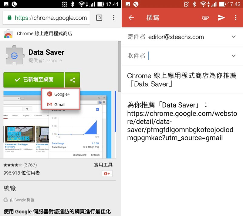 也可以點分享圖示透過 Google 或 Gamil 傳給朋友,如果還不想安裝也可以寄給自己備份。