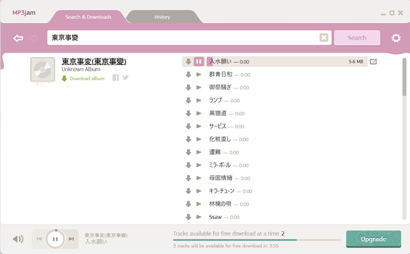 輸入歌手的話會依最新或最受歡迎來排序,如果是整張專輯也可以一次下載,不過要升級專業版才行,阿湯試過一個一個點的話會有時間限制,大致上 5 分鐘內只能連續下載兩首。
