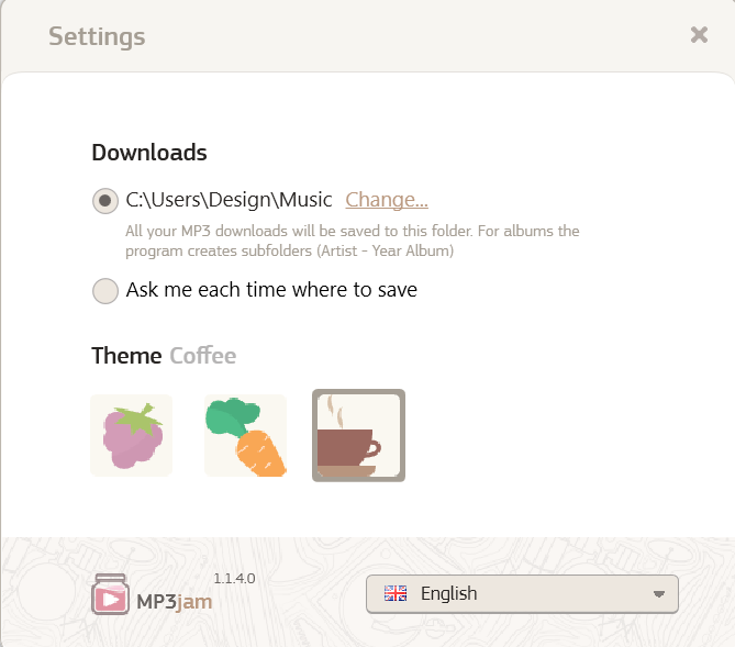 設定區可以更改預設的儲存資料夾,或改成每次下載前都確認,也有三種版面設計可切換,雖然沒有中文版,但操作上完全不會有障礙。