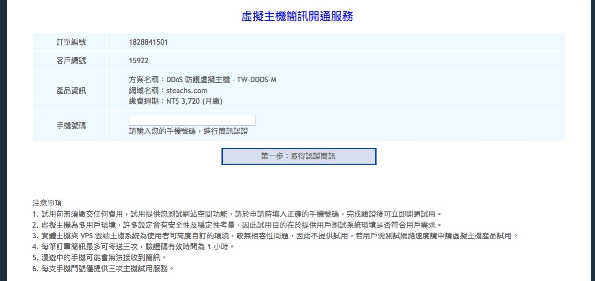 不論申請什麼主機方案,只要透過線上申請馬上就能完成開通使用,這邊以阿湯申請的 DDoS 防護虛擬主機為例,選擇方案後只要輸入要使用的域名後填寫相關資料並完成付款就可以了,如果需要搬家服務轉移到新申請的主機也可以在這裡一併提出,就會有專人和你連繫囉。