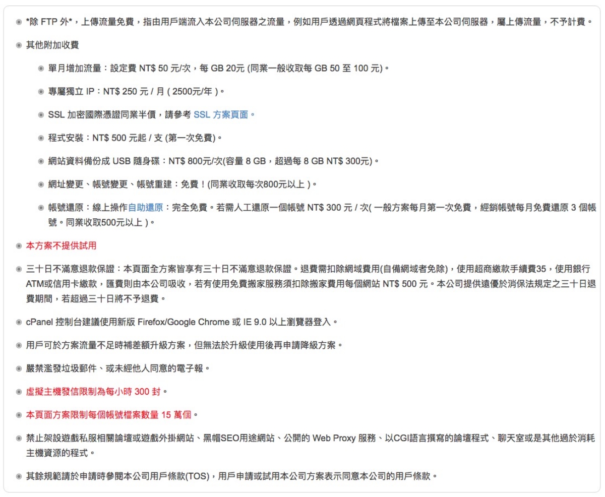有些企業可能會因為做活動而導致只有當月流量需求較高,那麼也不一定要升級方案,超過的流量都可以按量計算,所有的費用計算方式都很公開透明,之前阿湯就聽過有些個人的不肖業者計算方式很隨便之外,幾乎是胡亂收費啊,對於主機沒有什麼概念的人還是交給專業的吧。