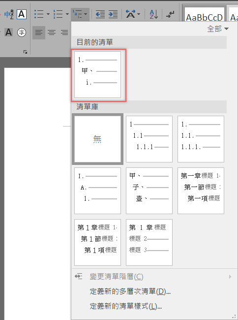 將三行反白全選後,點開多層次清單,隨便選一個樣式。