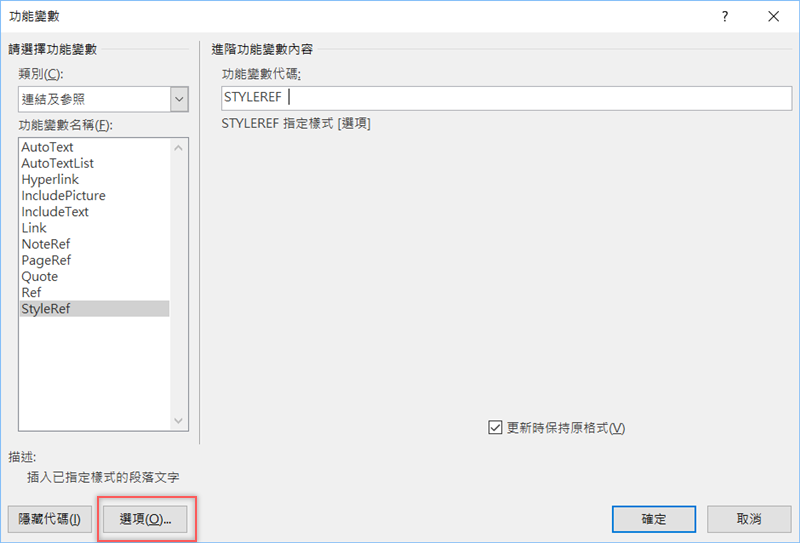 在左欄類別切換到「連結及參照」,然後找到最下面的「StyleRef」,點開選項。