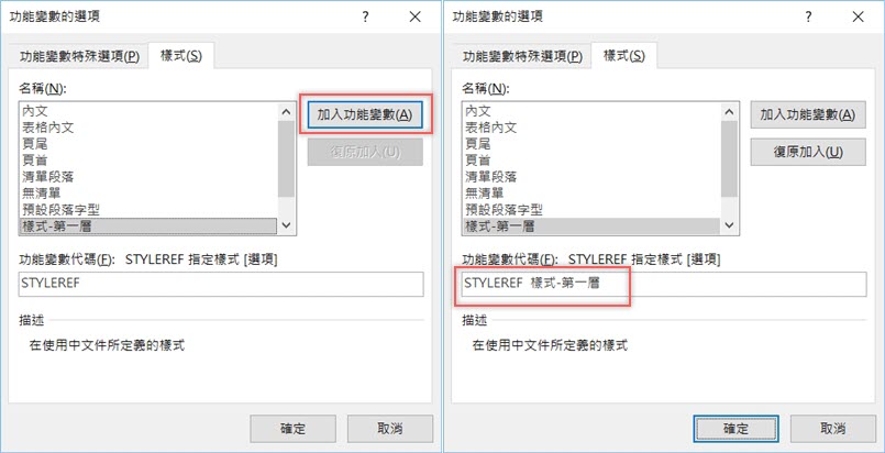 在樣式區底下的找到剛剛設定的名稱「樣式-第一層」,點「加入功能變數」,功能變數代碼會變成下面紅框內容。