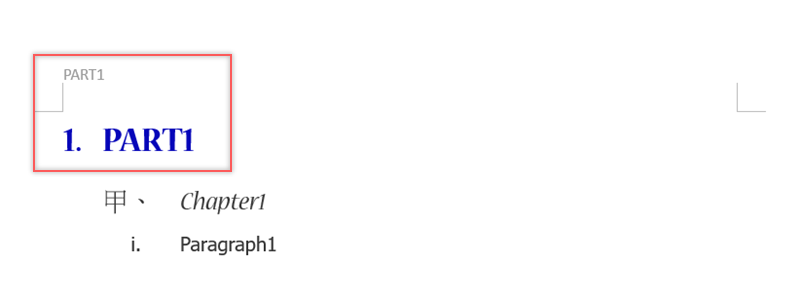 阿湯的頁首是沒另外加數字,所以第一項內容是什麼就會顯示什麼,像阿湯輸入「PART1」,頁首就會同步,這樣頁首就會依項目內容而顯示,做成書籍內頁的感覺。