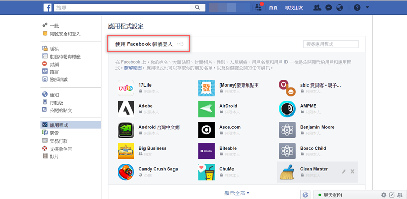在左欄找到應用程式,這裡就是所有使用 Facebook 帳號登入的程式,包括遊戲及一些網站、APP,你可能這時候才會發現怎麼那麼多?像阿湯就有一百多個,有的不知道什麼時候按到的早就忘記了。
