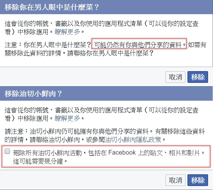跳出來的提示會因程式而異,有的還提供移除貼文的選項,但相同的是就算你移除了,對方還是可能保留你曾經分享的資料(不管是主動還是被動),真的很在意只能自行聯絡了。