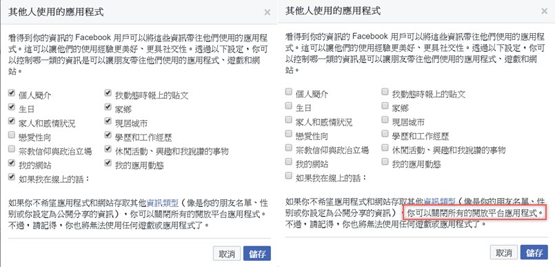 首先是關閉平台,這會讓你無法用臉書帳號去登入網站、遊戲或應用程式,朋友也無法透過這些程式跟你互動,重要的是,那些已經登入的應用程式將被刪除,如果你覺得用臉書比較方便,還是不要關閉吧。